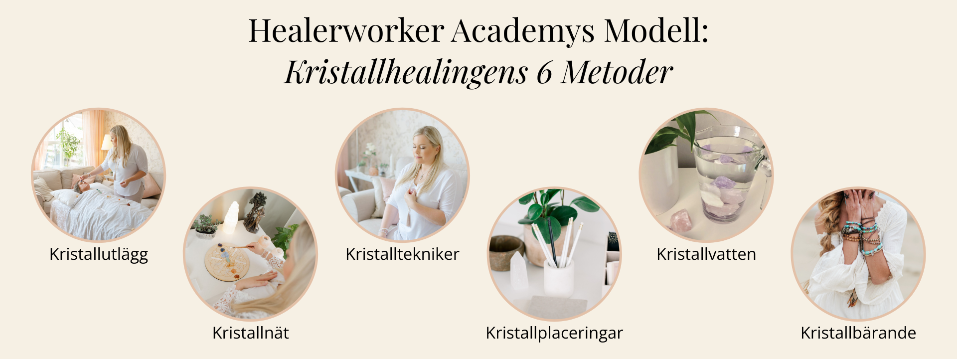 Det här är min modell för kristallhealing som jag har undervisat i både kurser, workshops och webinars. Själv drömmer jag om att en dag skriva en bok om dessa sex metoder – för jag upplever att ingen tidigare beskrivit kristallhealing på det här sättet, med en helhetsbild som gör det både enklare att förstå och mer kraftfullt att använda.
